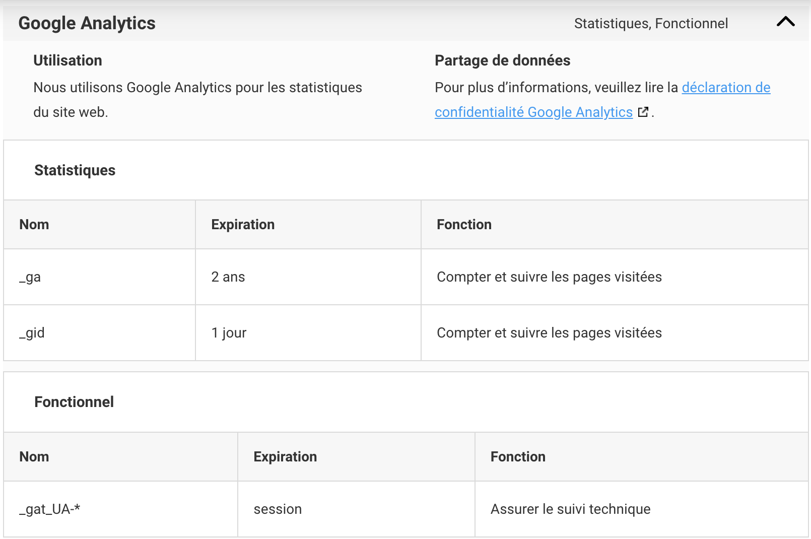 Les cookies sont les suivants :